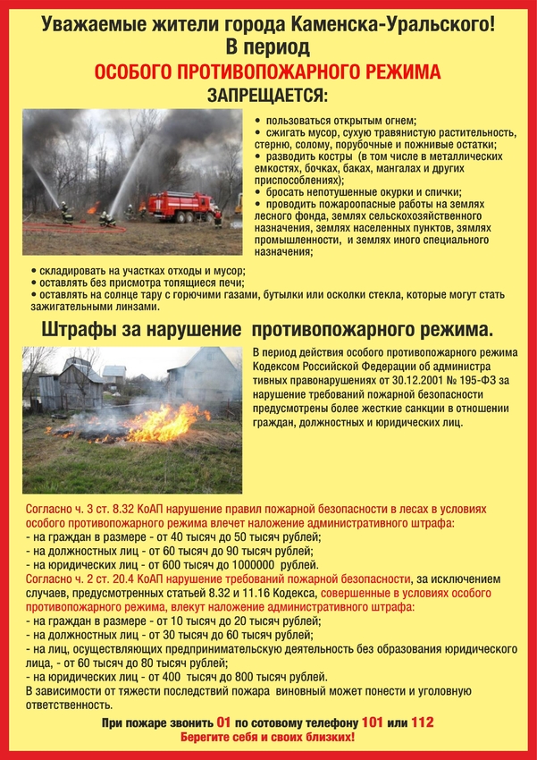 Постановлением Администрации Каменск-Уральского городского округа от 18 апреля 2025 года № 298 на территории Каменск-Уральского городского округа с 19 апреля 2025 года и до особого распоряжения устанавливается ОСОБЫЙ ПРОТИВОПОЖАРНЫЙ РЕЖИМ.