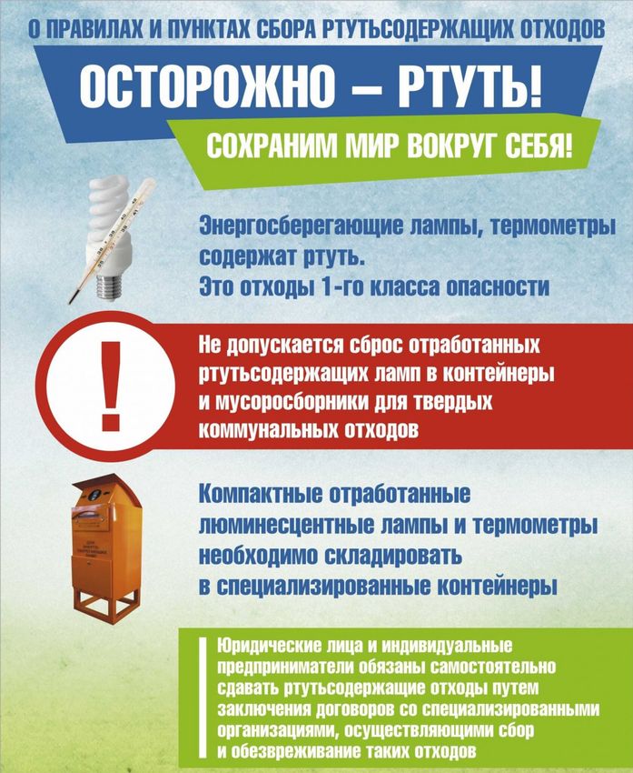 - выбрасывать ртутьсодержащие отходы вместе с другими коммунальными отходами — в контейнеры для сбора ТКО.