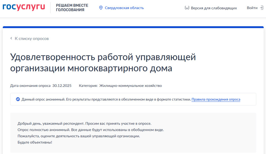 Опрос анонимный. Пройти его можно на портале «Госуслуги» по ссылке.