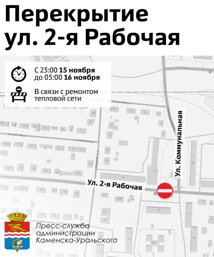 Движение транспорта по ул. 2-й Рабочей в районе перекрестка с ул. Коммунальной будет перекрыто в ночь с 15 на 16 ноября – в связи с заменой трубопровода под проезжей частью.
