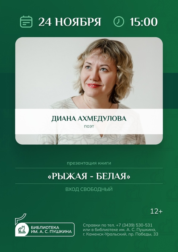 24 ноября в 15 часов в библиотеке им. А. С. Пушкина состоится презентация книги Дианы Ахмедуловой «Рыжая – белая».