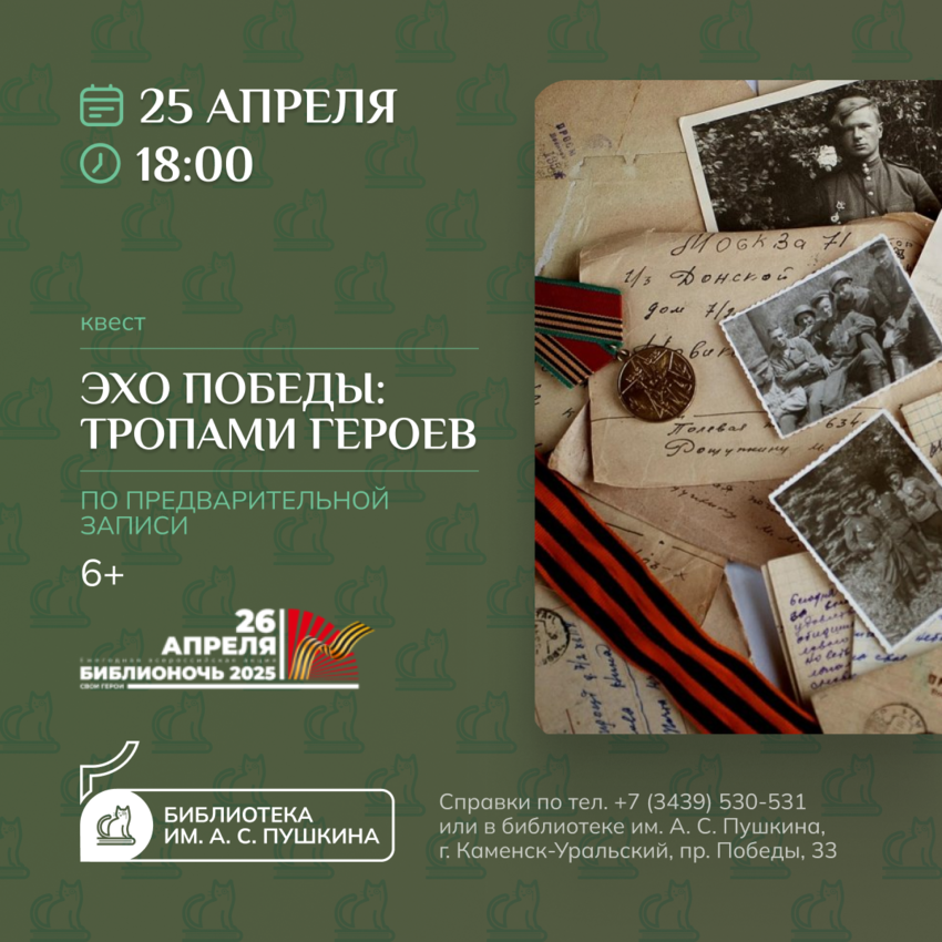 25 апреля в 18 часов в рамках Всероссийской акции «Библиосумерки» Пушкинка приглашает детей поучаствовать в квесте «Эхо Победы: тропами героев».