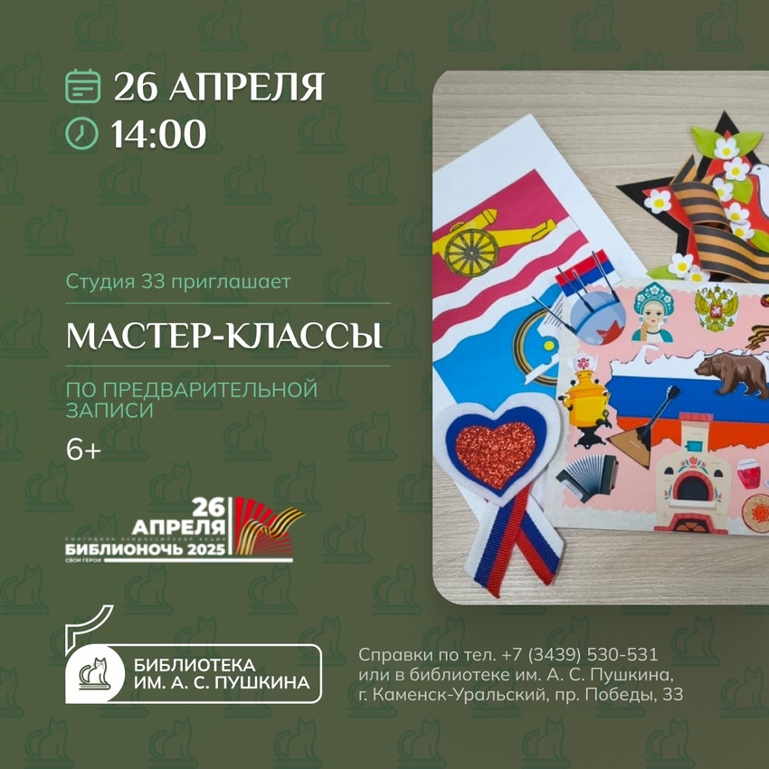 26 апреля в 14 часов «Студия 33» библиотеки им. А. С. Пушкина приглашает ребят принять участие в прикладных мастер-классах в рамках Всероссийской акции «Библионочь».
