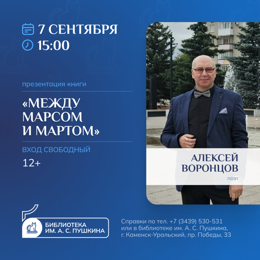 7 сентября в 15 часов в Центральной городской библиотеке им. А. С. Пушкина состоится презентация книги поэта Алексея Воронцова «Между Марсом и мартом».