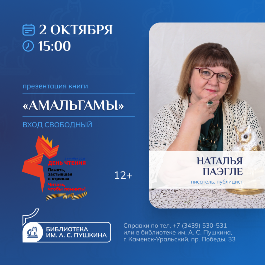 2 октября в 15 часов в Пушкинке состоится творческая встреча с писателем Натальей Паэгле. В рамках областной акции «День чтения» Наталья Михайловна представит свою новую книгу «Амальгамы».