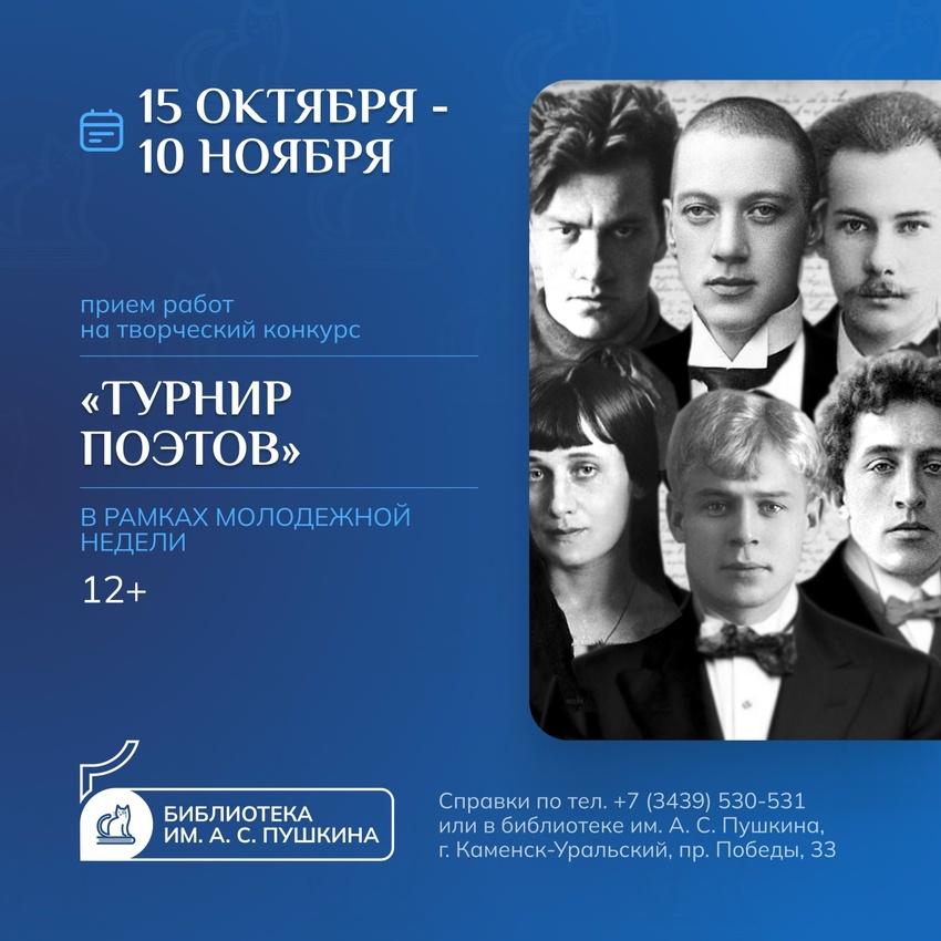 С 15 октября в библиотеке им. А. С. Пушкина начался прием заявок на творческий конкурс чтецов «Турнир поэтов», посвященный юбилеям поэтов Серебряного века: Александра Блока, Андрея Белого, Велимира Хлебникова, Бориса Пастернака и Сергея Есенина.