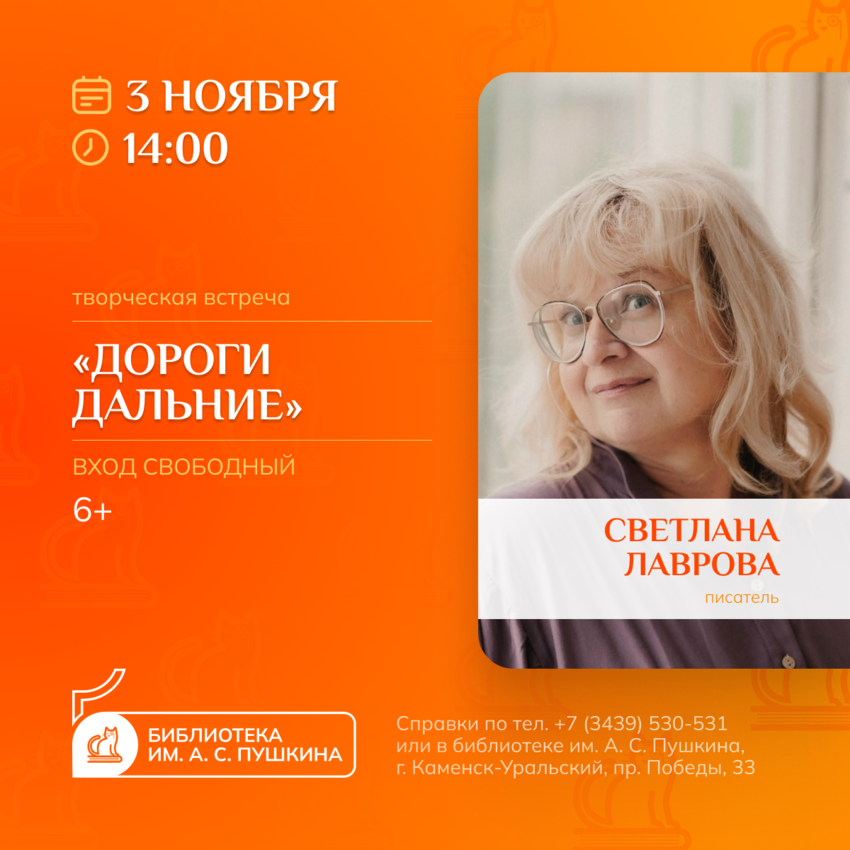3 ноября в 14 часов в библиотеке им. А. С. Пушкина состоится творческая встреча с писателем, автором сказок и познавательных книг для детей Светланой Лавровой.