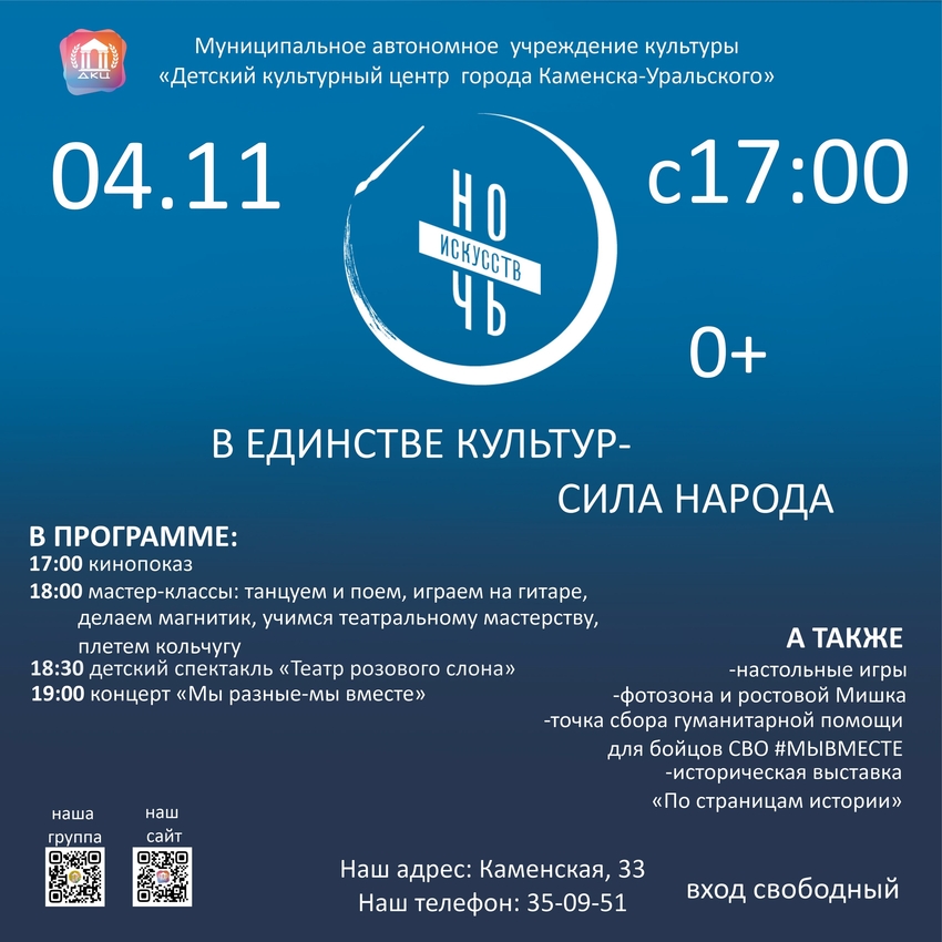 В Социально-культурном центре (ул. Ленина, 36) организуют показ детского мюзикла «Любить и помнить», экскурсии по зданию, бардовский концерт и кинопоказы. Начало мероприятий в 15:00. В ДК «Современник» (ул. Лермонтова, 133) с 16:00 подготовили мастер-классы и с 18:00 концерт Каменск-Уральской детской музыкальной школы № 3 «Наша сила в единстве». В Детском культурном центре (ул. Каменская, 33) праздник начнется в 17:00 с кинопоказа и мастер-классов по вокалу, гитаре, театру и декоративно-прикладному искусству. Вечером состоятся спектакль «Театр розового слона» и концерт «Мы разные — мы вместе». В ЦКР «Клевер» (ул. Кутузова, 21) в 18:00 зрителей ждут концертные номера, кинопрограмма для всей семьи и народные мастер-классы.