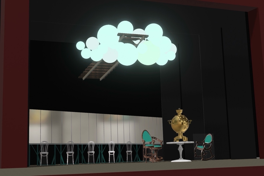 Огромный блестящий самовар станет главной доминантой сценографии в новом спектакле Драмы Номер Три. Ещё один яркий объект на сцене - железнодорожные пути, уходящие в облако из белых надувных шаров.