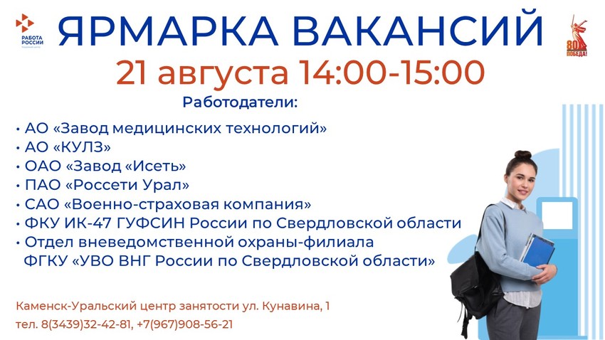 21 августа с 14:00 до 15:00 в Каменск-Уральском центре занятости состоится ярмарка вакансий.