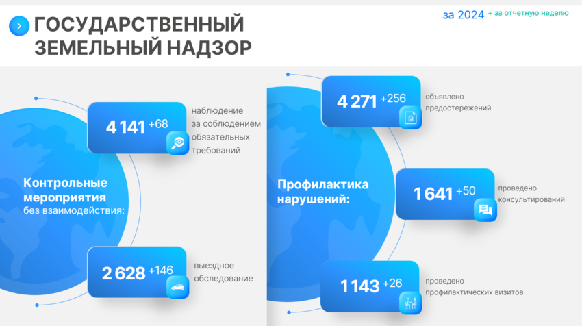 В период с 5 по 11 июля в Управлении Росреестра по Свердловской области по государственному земельному надзору, в рамках контрольных мероприятий, проведено 68 наблюдений за соблюдением обязательных требований и 146 выездных обследований.