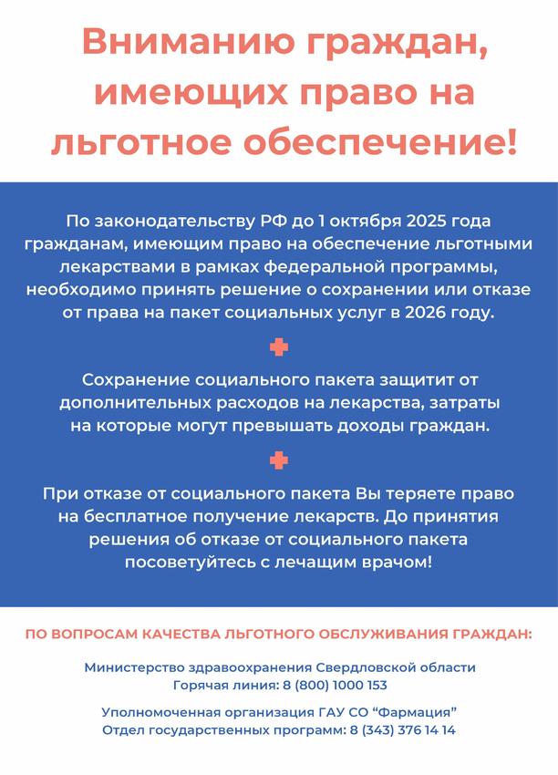В соответствии с законодательством Российской Федерации до 1 октября 2025 года гражданам, имеющим право на обеспечение льготными лекарственными препаратами в соответствии с Федеральным законом от 17.07.1999 № 178-ФЗ «О государственной социальной помощи», необходимо принять решение о сохранении или об отказе от права на пакет социальных услуг в 2026 году.