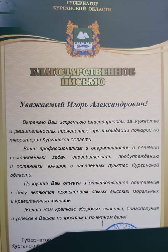 Игорь Александрович на протяжении двух недель стоял на защите Курганской области. В результате спасателям удалось отстоять Курганскую область от огненной стихии.
