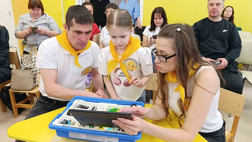 Но главное было впереди. Команды получили наборы Lego Education WeDo 2.0 и планшеты. Задача — за 30 минут собрать и запрограммировать модель вертолёта. На помощь пришли юные волонтёры из студии «Робототехника» Детского сада № 3. Пока родители искали нужные детали, дети колдовали над программами. И — о чудо! — все 11 вертолётов взлетели... ну, или хотя бы завращали винтами!